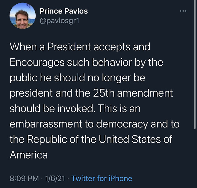 As a result, on Wednesday evening, Crown Prince Pavlos of Greece issued a statement on Twitter calling for the 25th Amendment of the United States Constitution to be invoked. The crown prince is well-versed in the consequences of successful coups in democratic countries, as it was one such insurrection that cost Pavlos’ father, King Constantine II, his throne and the continuation of the Greek constitutional monarchy. The message of the Crown Prince of Greece is as follows: “When a President accepts and Encourages such behaviour by the public he should no longer be president and the 25th amendment should be invoked. This is an embarrassment to democracy and to the Republic of the United States of America.“
